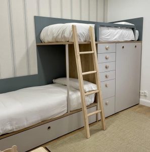 Cuando el espacio es limitado, las habitaciones juveniles requieren soluciones inteligentes. Una de las posibles soluciones que tenemos es optar por una litera, en alguna de sus versiones. Para esta habitación juvenil compartida por dos hermanos, hemos elegido una litera tren que integra dos camas y una gran zona de almacenamiento. La parte inferior cuenta con una cama nido, ideal para invitar a amigos. El módulo lateral ofrece cajones contenedor de gran capacidad, muy útiles para guardar juguetes y un armario de dos puertas, esencial para mantener el orden en cuartos para niños.