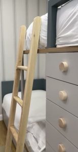 Para la escalera hemos optado por una de madera natural maciza, robusta y segura.