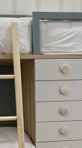 La combinación del gris suave de los frontales de los cajones contrasta con el azul grisáceo y la madera natural creando un ambiente atemporal.  Ese un diseño habitación juvenil que no pasará de moda y que se adaptará al paso del tiempo.
